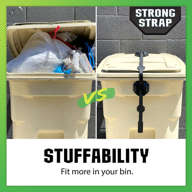 ”Stuffability” allows you to fit 1-3 extra bags in your trash can and crush cardboard, all while keeping the lid shut. Strong Strap™ eliminates litter from overflow, keeps recycling dry, and it's an aesthetic improvement. Learn More.