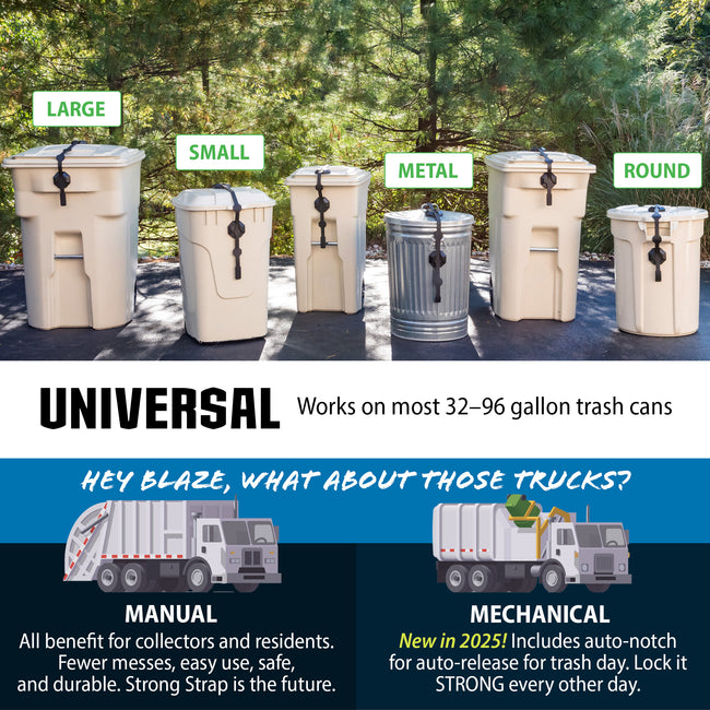 - Universal: Strong Strap™ attaches to most 32–95 gallon garbage can that has a handle.