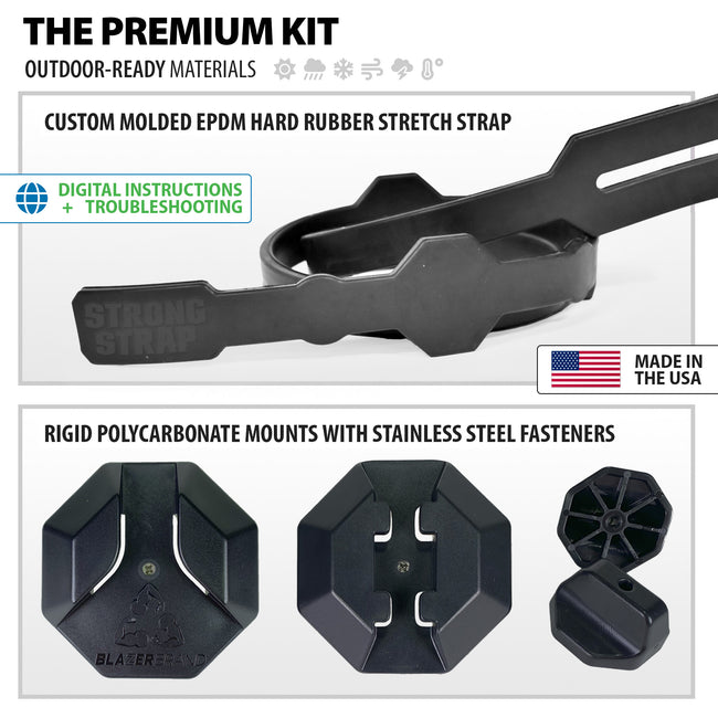 Strong Strap’s easy—no tools required—installation locks to any standard curbside waste container. Rugged parts are built with outdoor-ready materials adopted from the defense and housing industries. Strong Straps may be the only lid-locking device tough enough for trash.